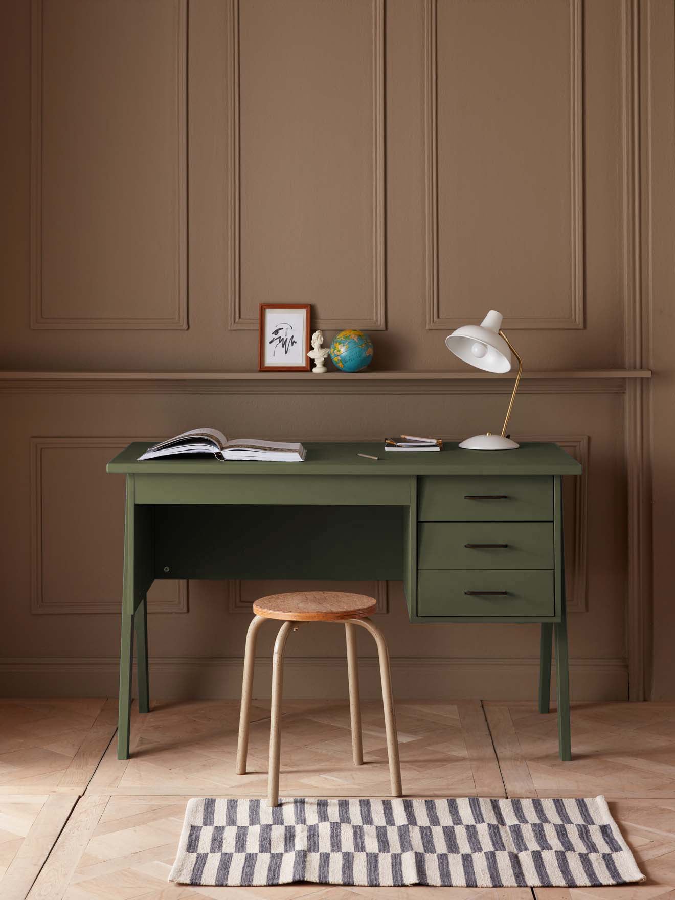 Pieds compas, 3 tiroirs obliques et poignées en laiton. Ce bureau au design épuré emprunte les codes du style rétro.