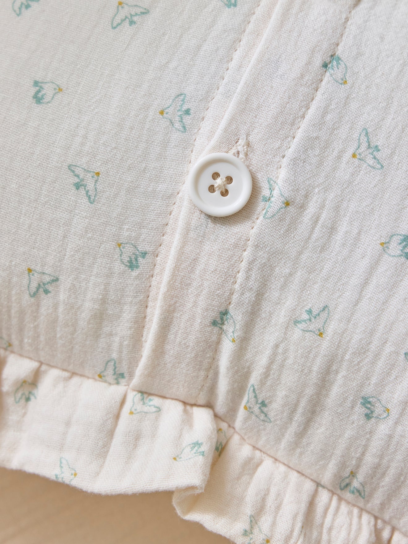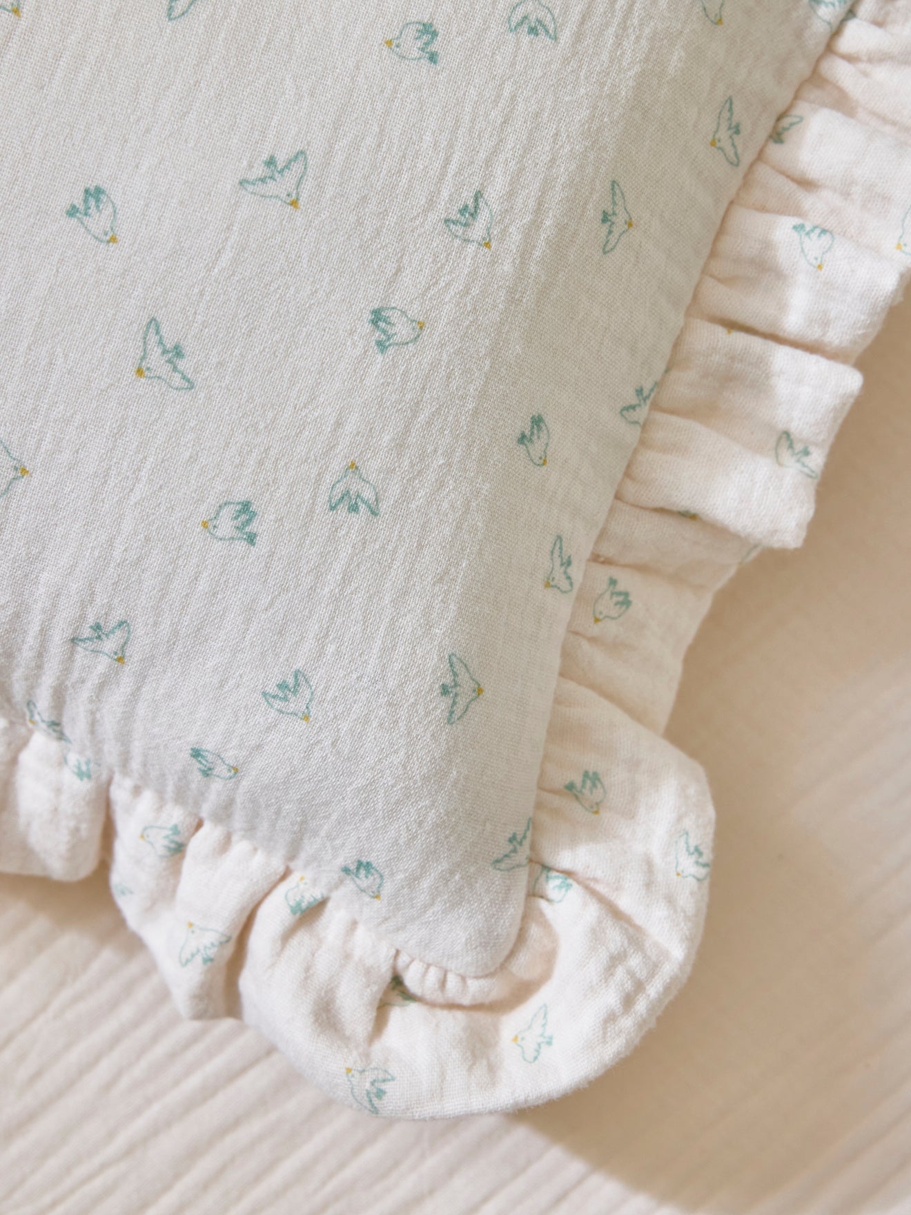 Fantaisie, charme et élégance. Petit coussin en gaze de coton bordé d'un large volant. Déhoussable au dos par boutons.