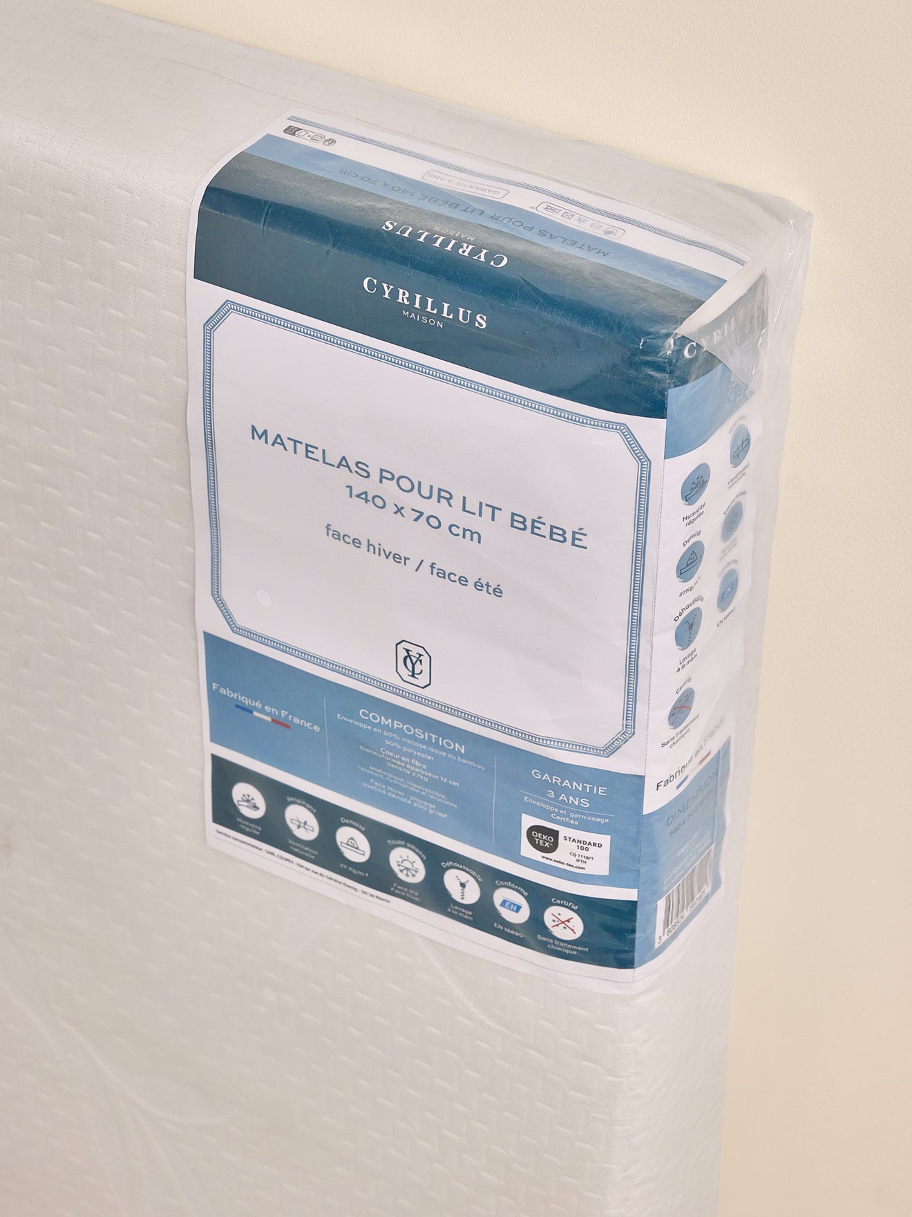Matelas "climatisé" pour lit bébé, conçu pour le confort thermique des tout-petits. Matelas déhoussable, fabriqué en France et livré dans une housse.
