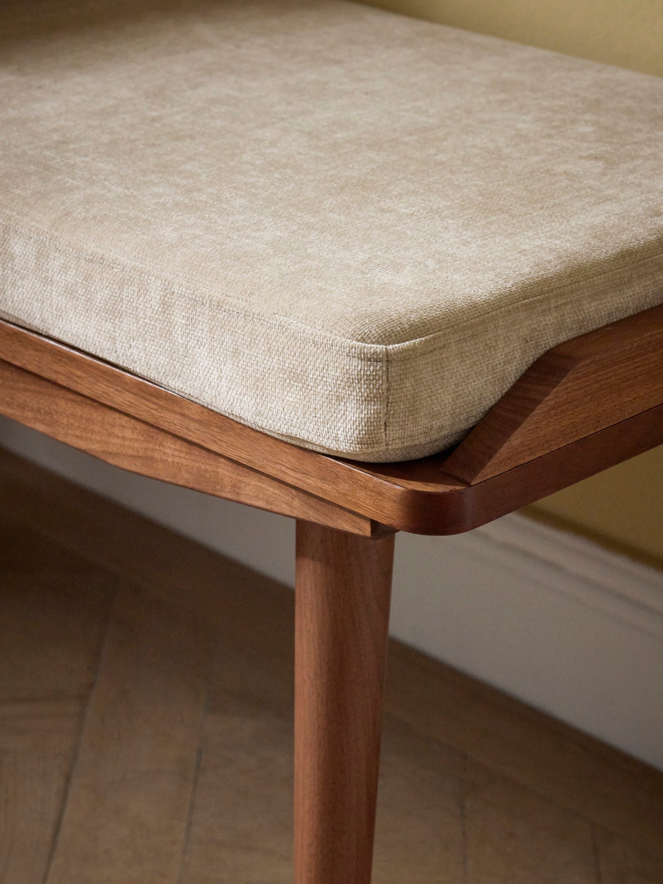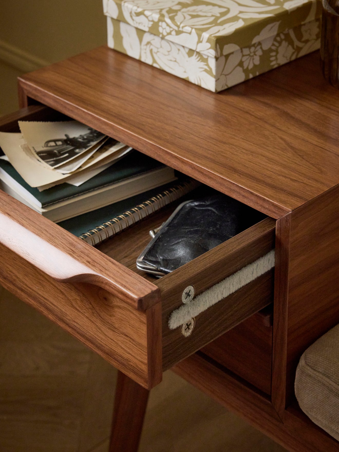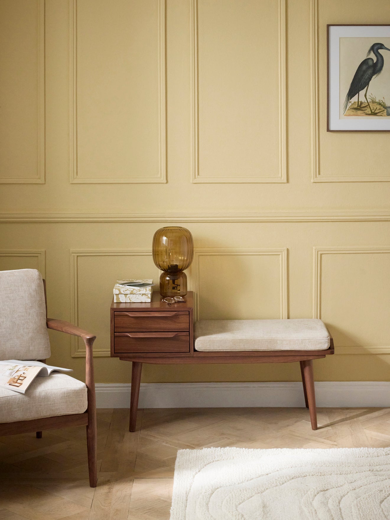Petit meuble d'entrée inspiré de la banquette téléphone des années 60. Un design vintage revu au goût du jour avec ses petits rangements, sa banquette en velours et ses pieds fuselés.