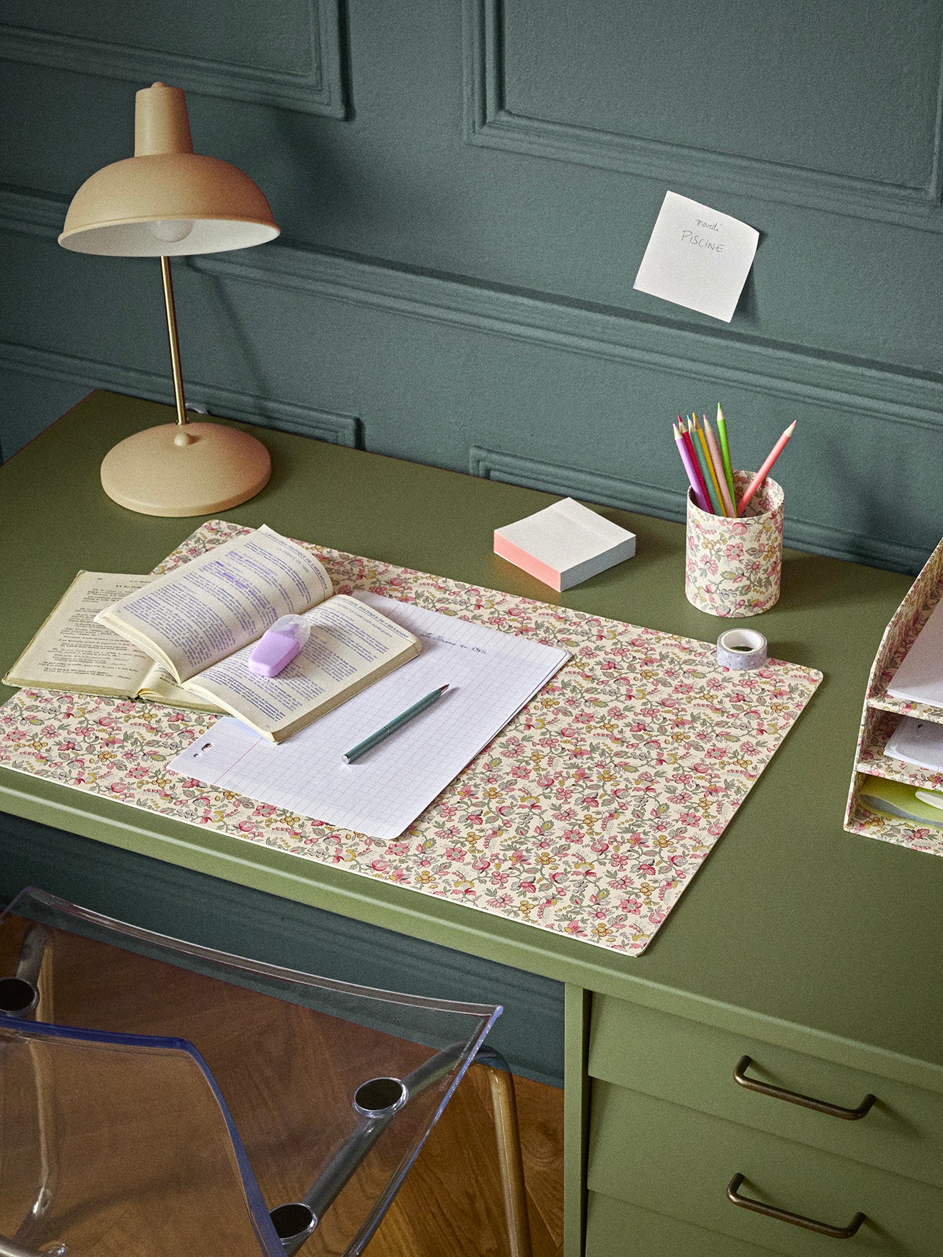 Sous-main en papier carton légèrement structuré. Impression recto/verso et contour huilé. Objet unique, pratique et décoratif ; idéal pour protéger une table ou bureau.