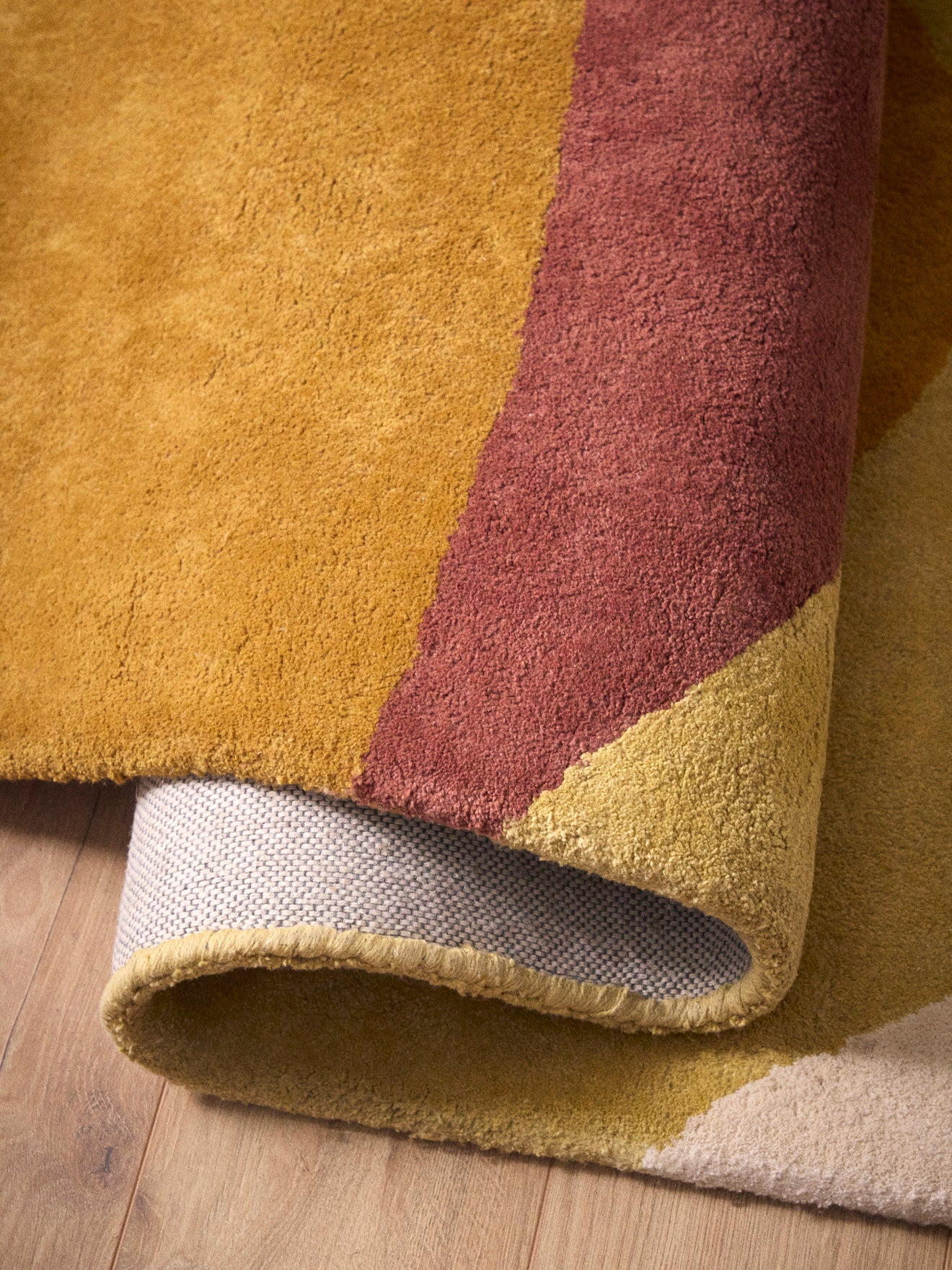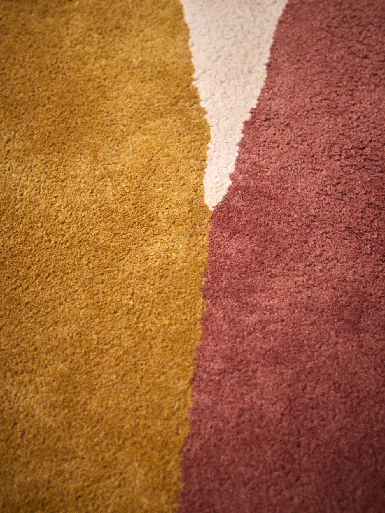 Tapis Paysage doux, épais, sain et confortable en coton biologique. Son motif "coucher de soleil" façon épuré réchauffe la pièce de ses tons terres et neutres. Tapis en pur coton certifié GOTS*, tissé et tufté à la main en Inde.