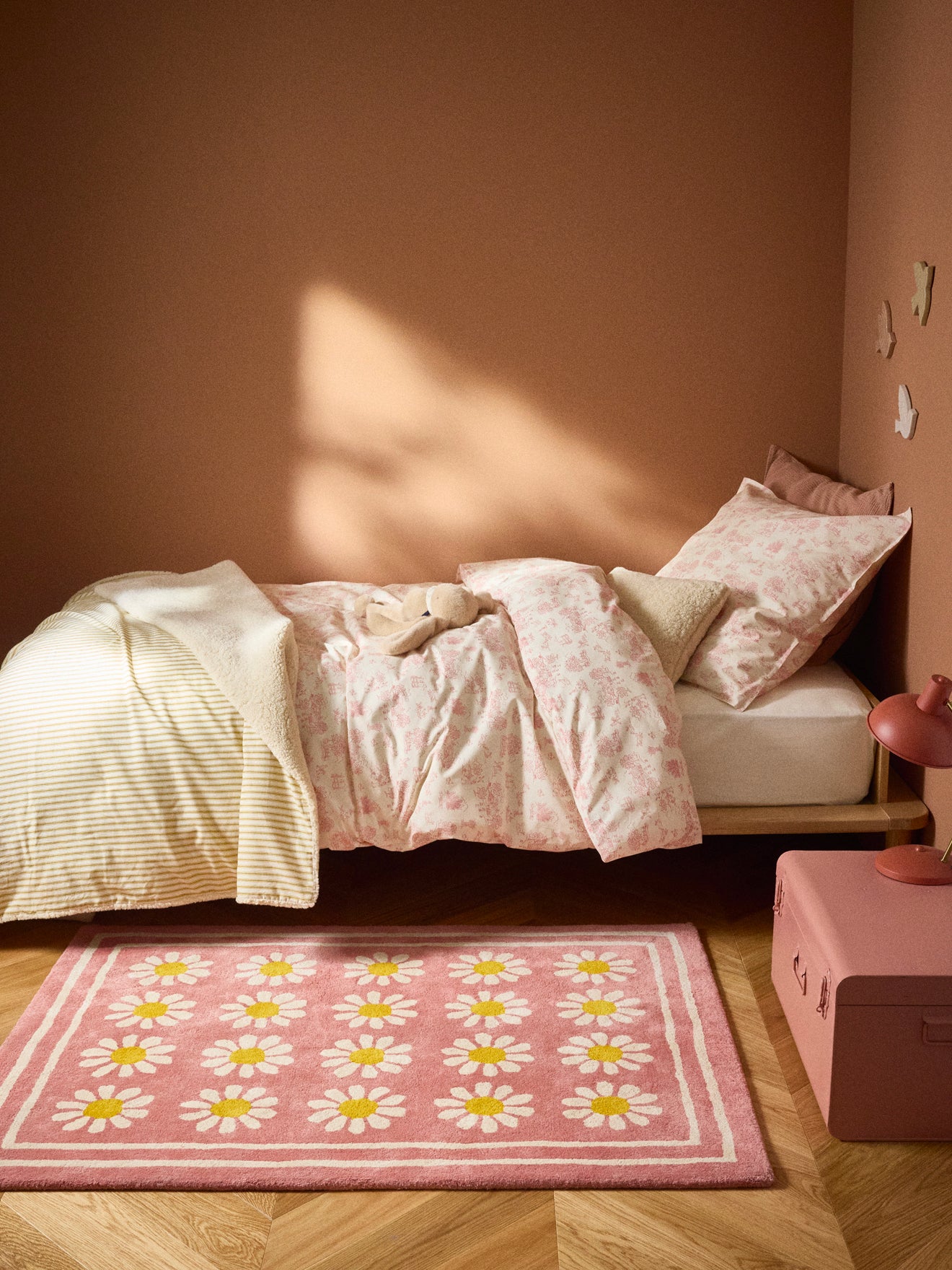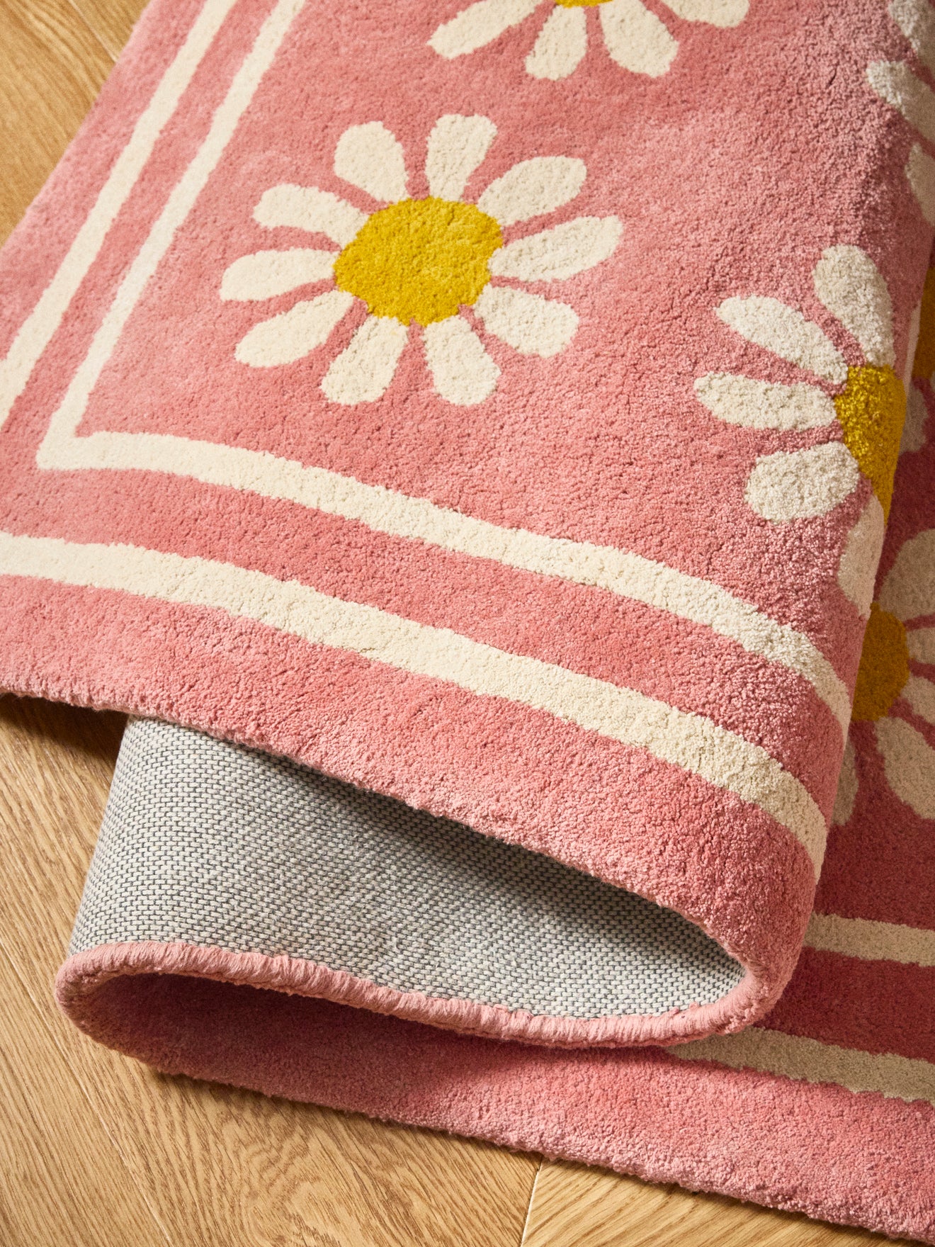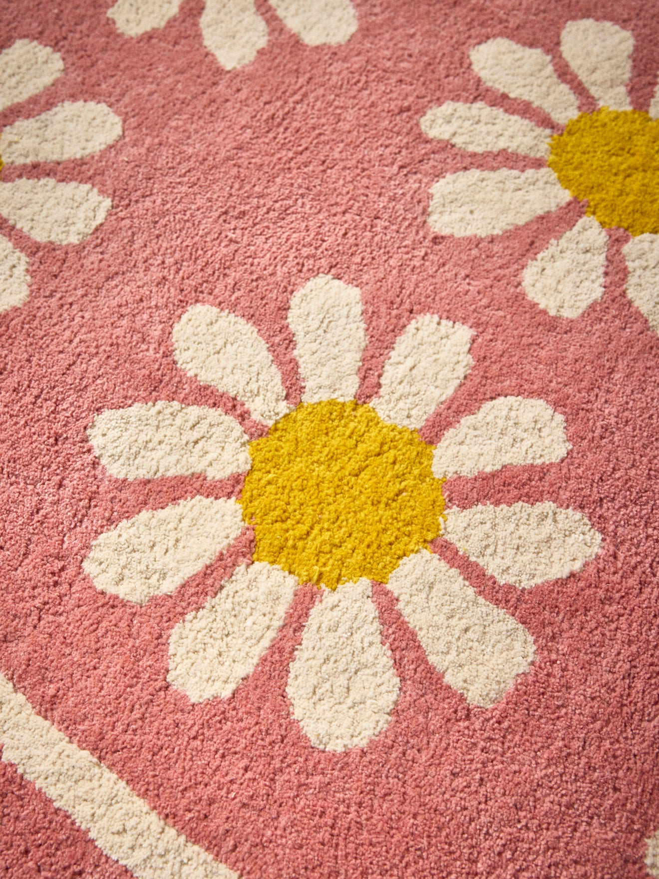 Tapis Marguerite doux, épais, sain et confortable en coton biologique. Son motif fleuri apporte à la pièce une touche de fraicheur et de gaité dans un esprit rétro. Tapis en pur coton certifié GOTS*, tissé et tufté à la main en Inde.