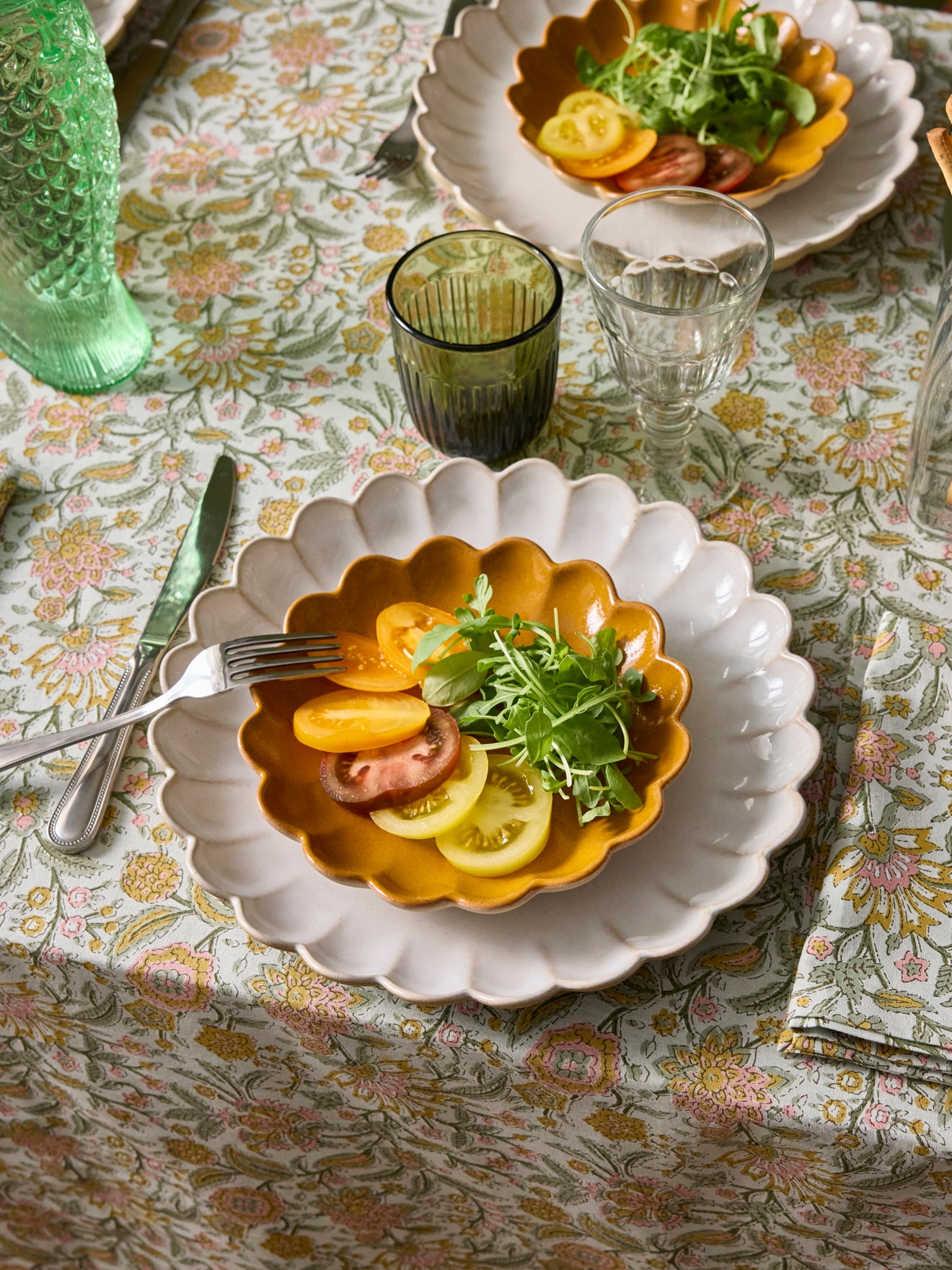 La gamme Marrakesh est produite par la marque de céramique de table Costa Nova. Originaire du charmant village éponyme situé sur la côte Portugaise, Costa Nova est reconnue pour la qualité et la durabilité de ses produits. La gamme Marrakesh est conçue par l'artiste floral français Christian Tortu. Elle allie harmonieusement l'artisanat durable, l'essence de la nature et la mystique marocaine. L'assiette à dessert (ou à entrée) Marrakesh est reconnaissable par sa forme de fleur.