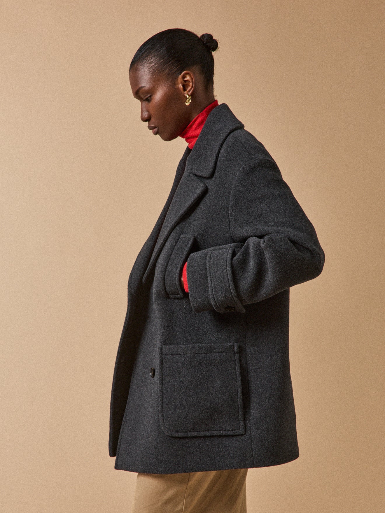 Confectionné en Europe dans un lainage certifié bien chaud de la maison italienne Manteco, le manteau revisite l'esprit caban avec un volume généreux, un large col cranté, des maxi poches et un coloris chiné qui le démarque.