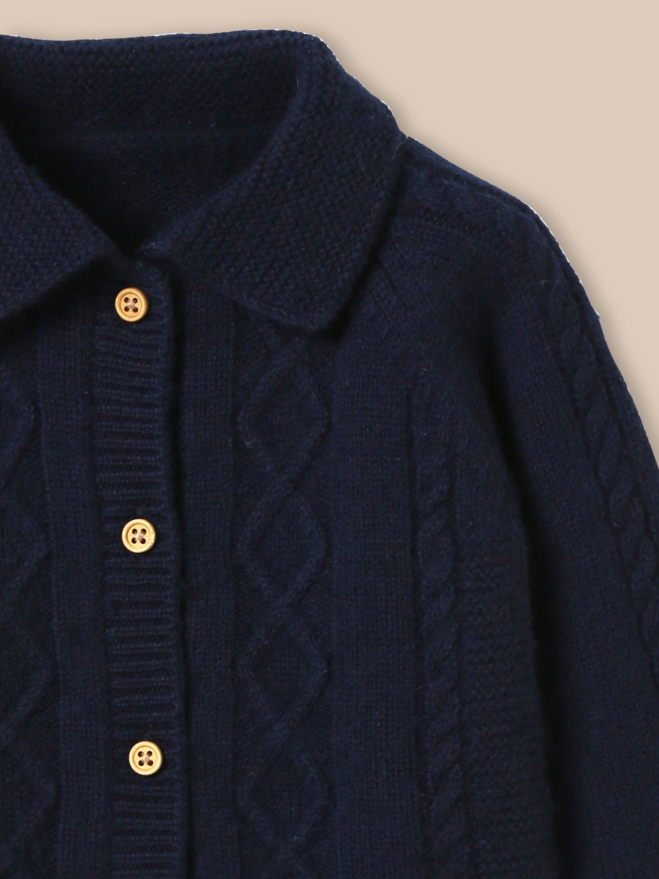 Un ensemble chaud en laine majoritaire et coton biologique, travaillé sur une maille fantaisie et un jeu de torsades raffiné.