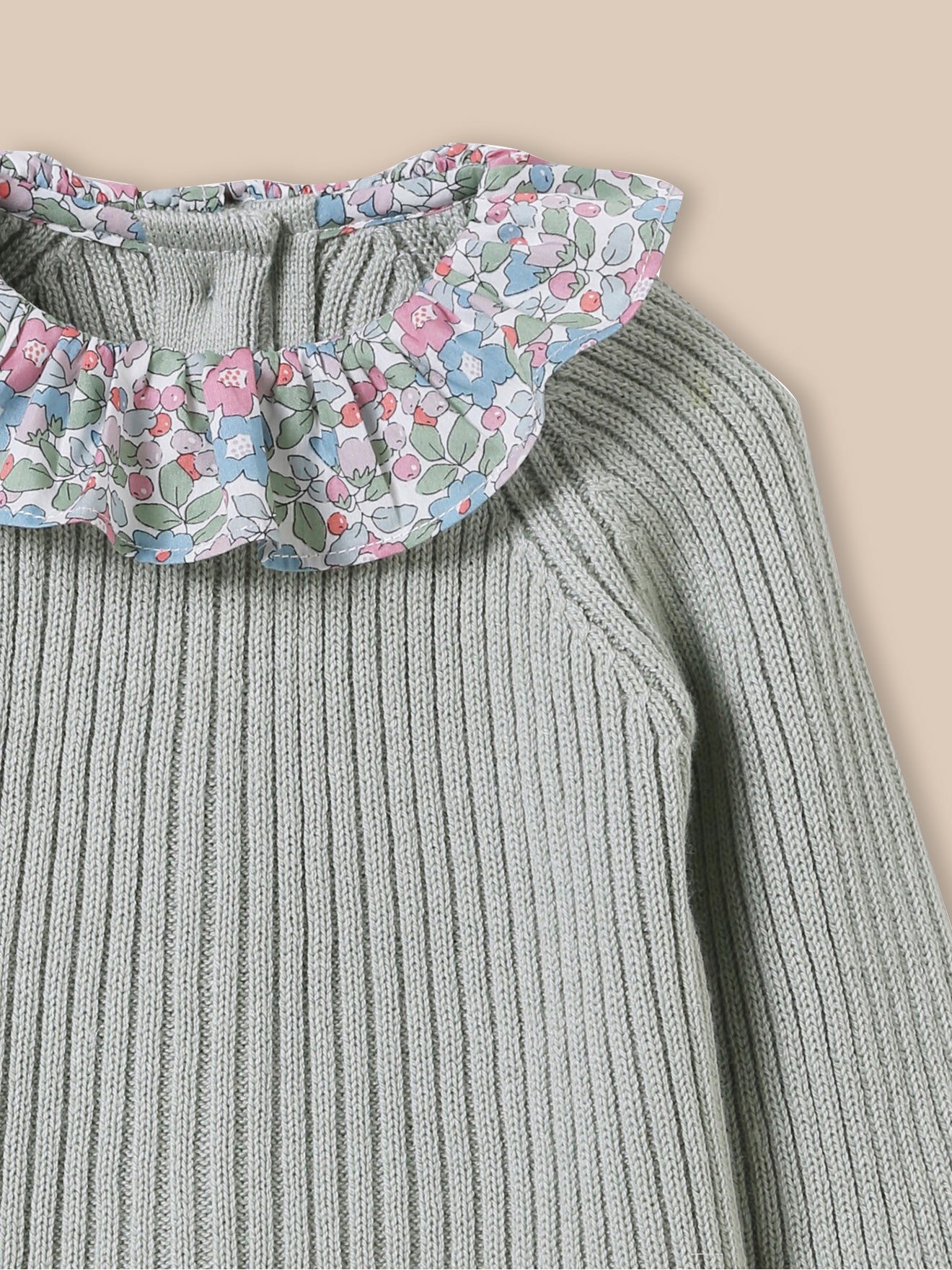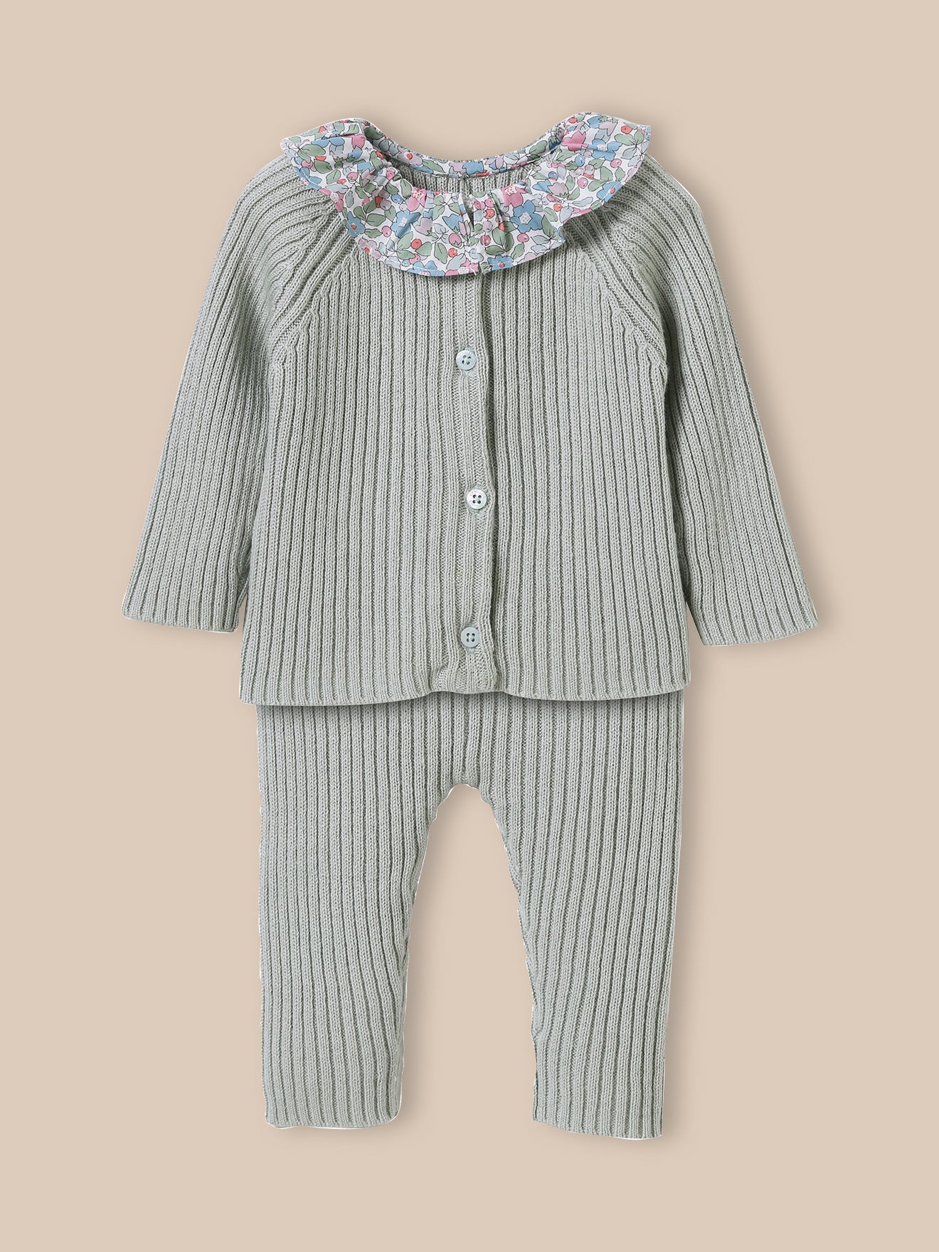 Ensemble en tricot aux matières naturelles, rehaussé d’un col en tissu Liberty : le parfait cadeau de naissance.