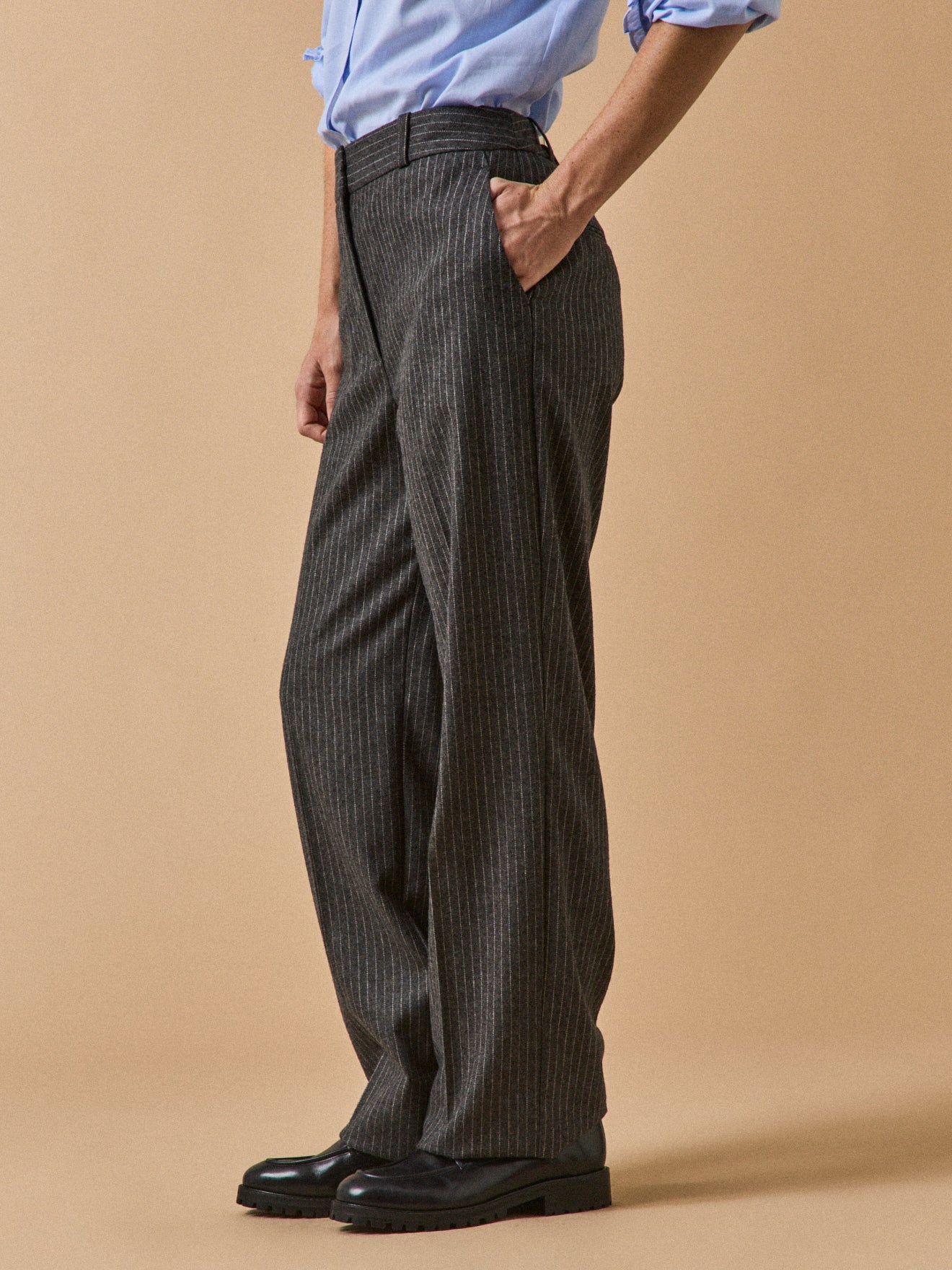 Rayures tennis chic et mode sur volume droit indémodable, tissu italien de grande qualité et confection Europe... Le pantalon de tailleur rayé est un modèle de référence, une pièce essentielle du vestiaire urbain chic. Il se porte au quotidien avec un col roulé ou en mode working avec une chemise. Tissu et confection Europe.